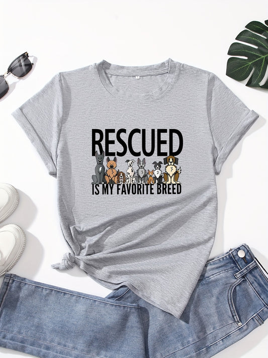 RESCUED & Dogs Print Crew Neck T-Shirt, Casual Short Sleeve Top For Spring & Summer, Women's Clothing